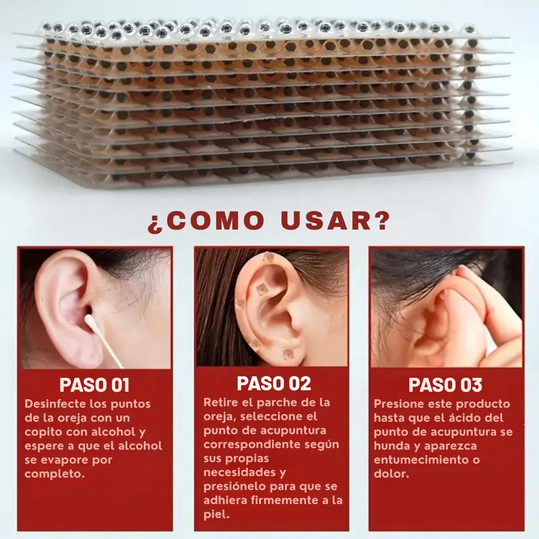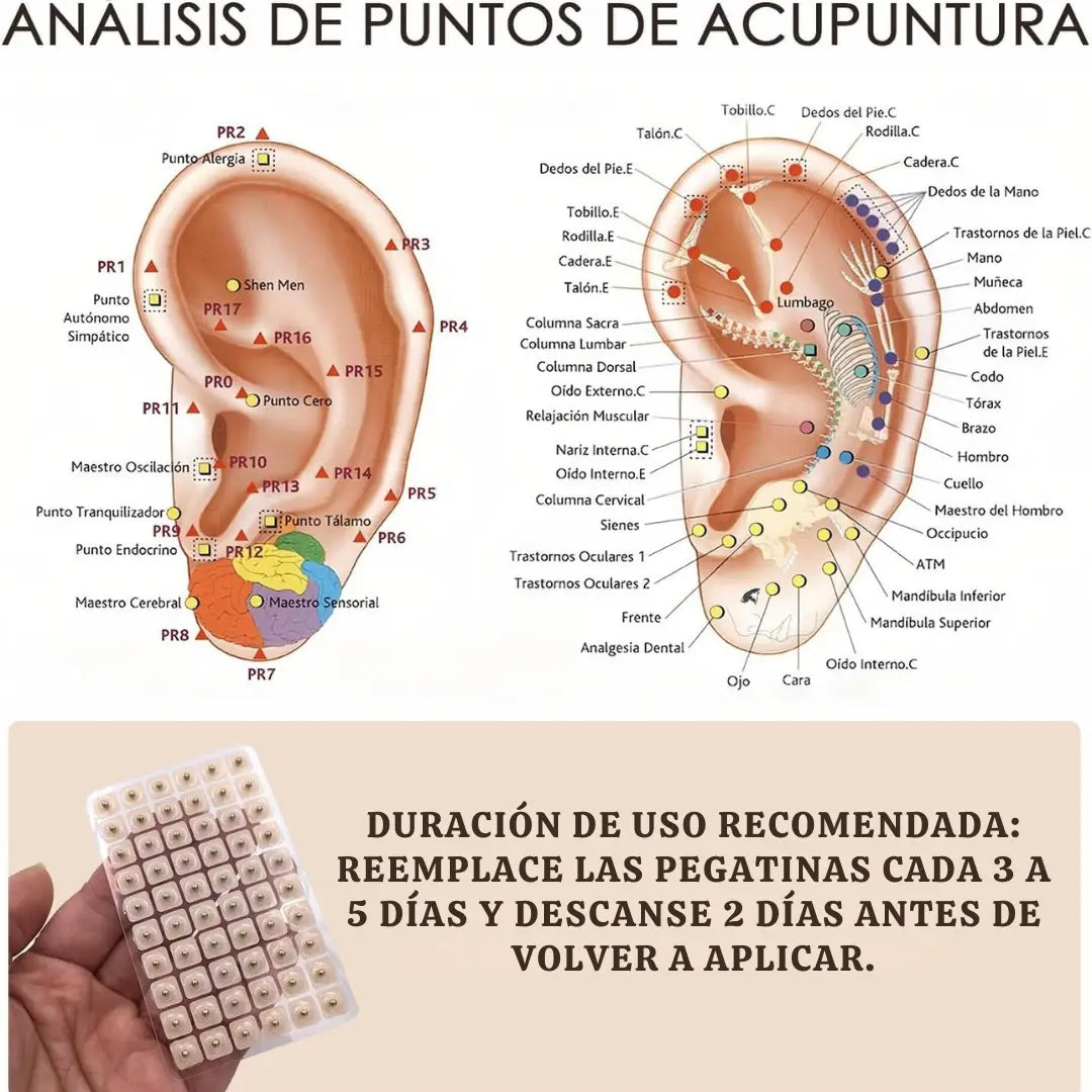 🔹 Estimulación natural por acupresión: actúan en puntos clave de la oreja para apoyar procesos de bienestar.